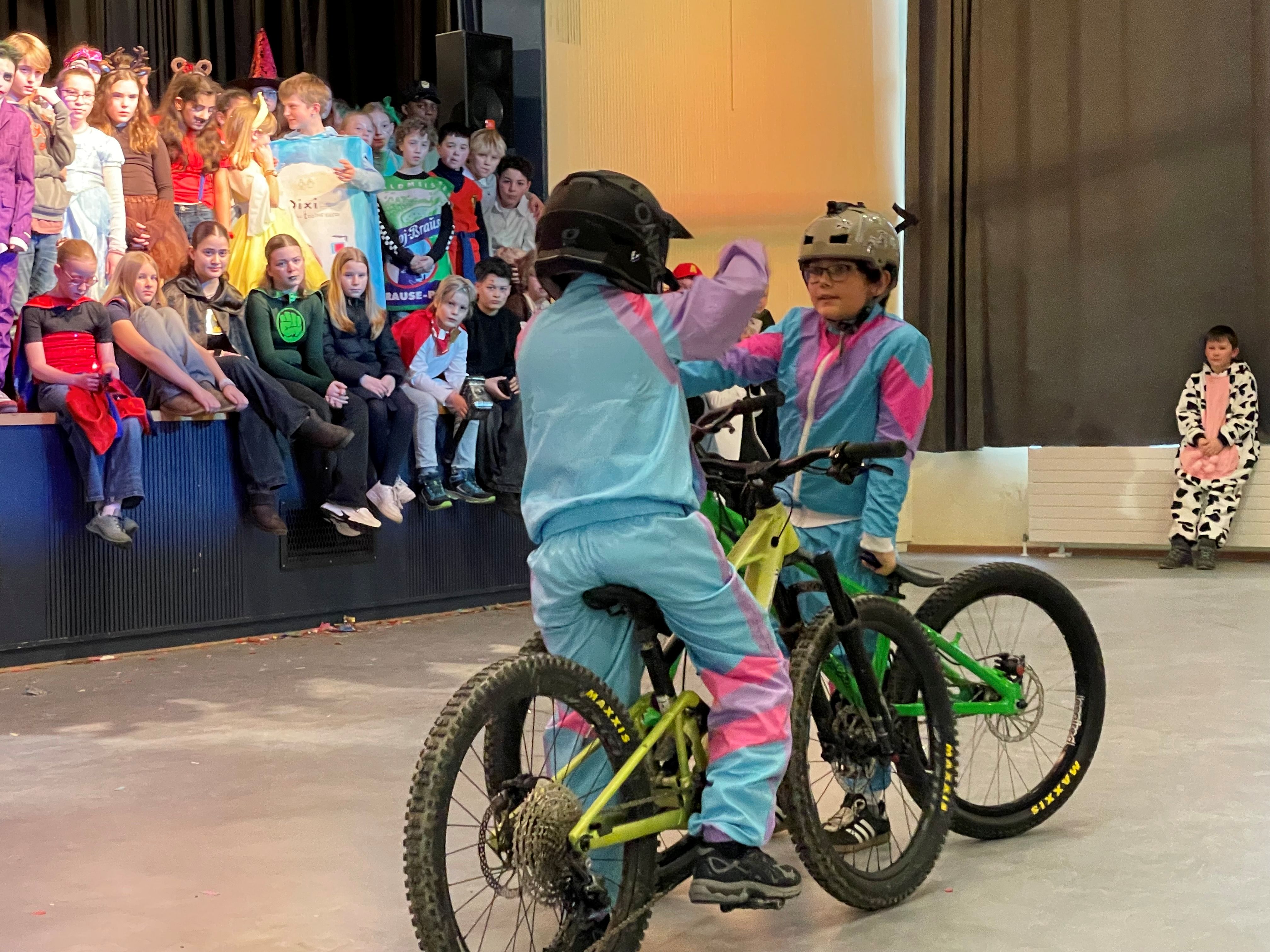 Am Dienstag, den 10. Februar, verwandelte sich die Schulaula des SLG von 14:30 bis 16:30 Uhr in eine farbenfrohe Karnevalswelt. Die gesamte Unterstufe – alle Klassen der Jahrgänge 5 und 6 – feierte gemeinsam eine fröhliche und rundum gelungene Unterstufenparty. Durch das abwechslungsreiche Programm führten Herr Niklas, Frau Brockhöft und Herr Gerlach, die mit viel Engagement und Humor für einen reibungslosen Ablauf sorgten. Schon zu Beginn war spürbar, wie sehr sich die Schülerinnen und Schüler auf diesen besonderen Nachmittag gefreut hatten. Vielfältiges Programm auf der BühneDas Programm konnte sich sehen lassen: Mitreißende Gesangsauftritte und schwungvolle Tänze sorgten für Begeisterung im Publikum. Ein besonderes Highlight war die Mountainbike-Trickshow, die mit beeindruckenden Kunststücken für staunende Gesichter und großen Applaus sorgte. Mehrere Polonaisen schlängelten sich quer durch die Halle und zeigten einmal mehr, dass gemeinsames Feiern verbindet. Für echte Karnevalsstimmung sorgte außerdem der Auftritt des Ründerother Karnevalsverein, der mit seinem Programm und natürlich mit einer ordentlichen Portion Kamelle die Stimmung weiter anheizte. Kreative Kostüme ausgezeichnetEin weiteres Highlight der Unterstufenparty war die Wahl der besten Kostüme – und auch in diesem Jahr fiel der Jury die Entscheidung nicht leicht. Ausgezeichnet wurden: