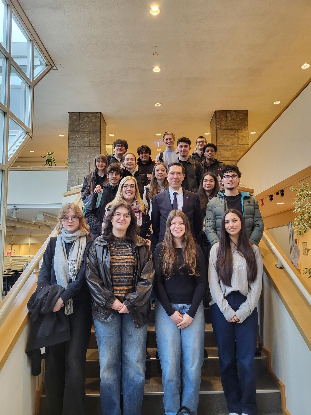 Die Schülerinnen und Schüler hatten im Vorfeld Fragen vorbereitet, die während des Gesprächs ausführlich beantwortet wurden. Dabei ging es unter anderem um bereits umgesetzte und geplante Projekte in der Stadt. Herr Halding-Hoppenheit berichtete beispielsweise über Pläne zur Vergrößerung der Schwalbe Arena und betonte, dass ihm Themen wie Sicherheit und Sauberkeit in Gummersbach besonders wichtig seien. Auch Fragen zu Fußball- und Sportplätzen sowie zu deren Sanierung wurden angesprochen. Darüber hinaus erklärte der Bürgermeister, weshalb er sich politisch für die CDU entschieden hat, und gab den Schülerinnen und Schülern Einblicke in seinen Arbeitsalltag. Ein weiteres Thema waren neue iPads für Schulen: Insgesamt sollen etwa 3.000 neue Geräte mit 128 GB Speicher angeschafft werden. Was mit den bisherigen iPads geschehe, sei noch nicht endgültig entschieden – mögliche Optionen seien Weitergabe oder Verschrottung. Auch die Bedeutung der Amtskette wurde thematisiert. Sie symbolisiere die besondere Stellung des Bürgermeisters innerhalb der Stadt. Getragen werde diese nur bei ganz speziellen Anlässen. Im Anschluss an das Gespräch erhielten die Schülerinnen und Schüler noch eine kurze Führung durch das Rathaus. Herr Halding-Hoppenheit betonte, wie wichtig ihm solche Treffen seien, um zu erfahren, welche Themen junge Menschen beschäftigen. Der Kurs zeigte großes Interesse und nutzte die Gelegenheit, viele Fragen zu stellen und Einblicke in die kommunale Politik zu gewinnen.