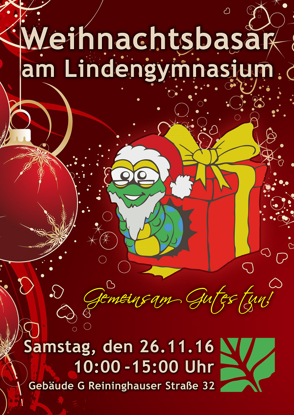 Am Samstag, dem 26.11.2016, waren die Türen des Städtischen Lindengymnasiums Gummersbach weit geöffnet, um der gesamten Schulgemeinde und der interessierten Öffentlichkeit Einlass zum Lindenbasar zu gewähren. An zahlreichen, liebevoll vorbereiteten und gestalteten Ständen war für jeden etwas dabei: ob selbst Gebasteltes, Kulinarisches oder etwas aus dem künstlerisch-musischen Bereich. Viele nutzten auch die Gelegenheit, sich einen Eindruck von dem neuen Lindenforum und dem umgestalteten Schulhof zu machen. Gleichzeitig bot diese Schulveranstaltung aufgrund ihres caritativen Schwerpunktes die Möglichkeit, gemäß des diesjährigen Mottos "Gemeinsam Gutes tun" regionale und globale Projekte zu unterstützen. Die Höhe des Erlöses und die einzelnen Zuwendungen werden auf einer gesonderten Pressekonferenz im Januar 2017 bekannt gegeben. Allen, die zum Gelingen des Lindenbasars durch ihre Mitarbeit oder durch ihre Unterstützung beigetragen haben, möchten wir unseren herzlichen Dank aussprechen und wünschen eine besinnliche Adventszeit.